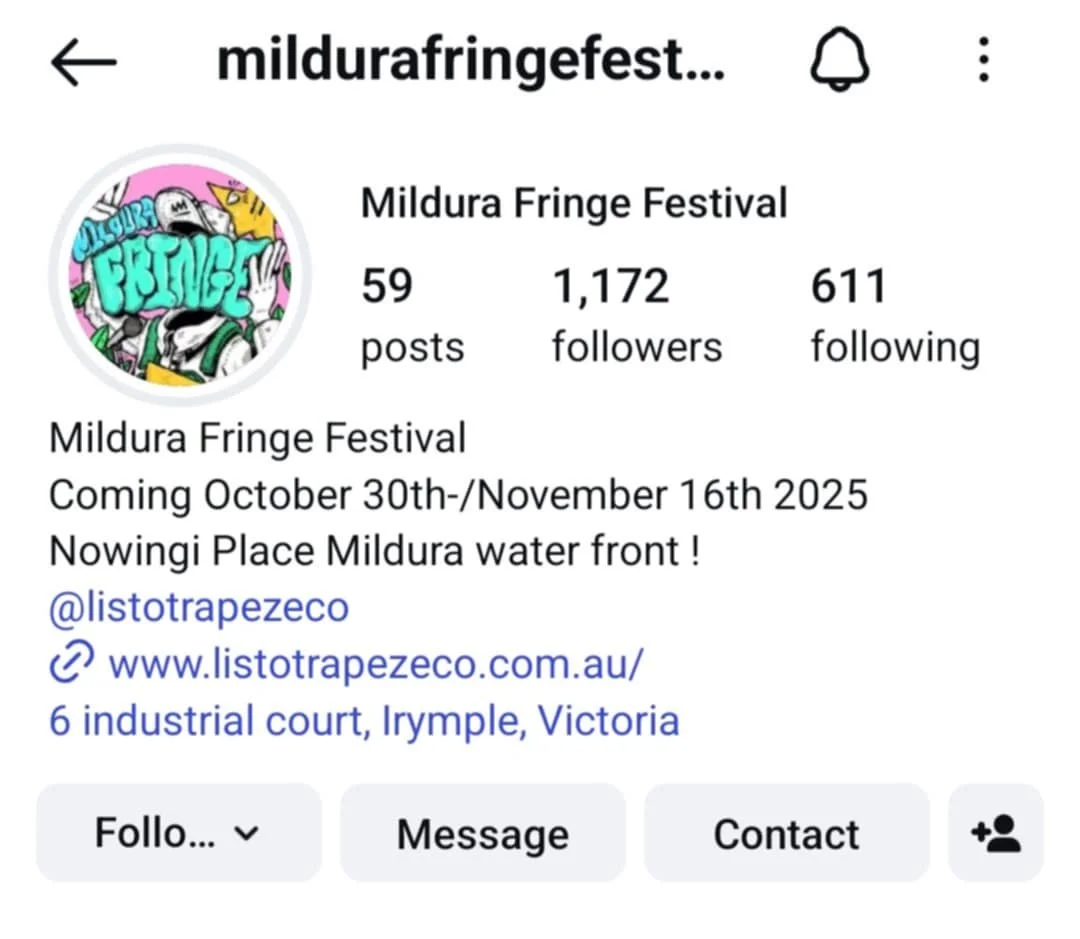 Thursday October 30th - Sunday November 16th 2025 TICKETS ON SALE Sept 2025 Family Friendly Shows TICKETS ON SALE Sept 2025 not-so-family-friendly Shows(adults only 18+) shake it burlesque PLEASERS I GOT BIT BY A MONKEY ONCE LATE NIGHTLOOSE SHOW Follow us on socials facebook.com/mildurafringefestival @mildurafringefestival