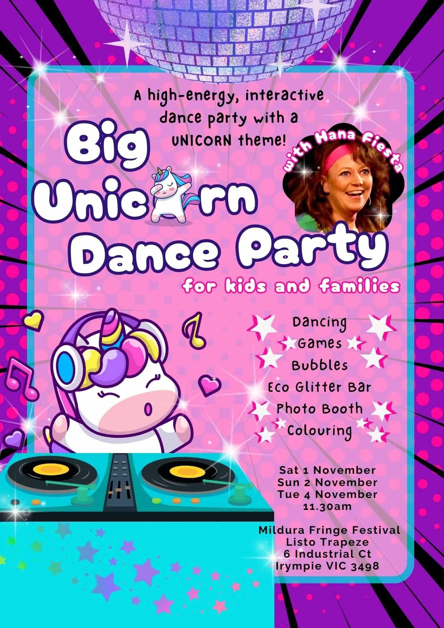 Hana Fiesta is a Melbourne based children’s entertainer with years of experience in entertaining at birthday parties and events. Her best friend is a big purple unicorn called Betty. After touring her debut show ‘Hana Fiesta’s Disco Fiasco’, Hana devised the Big Unicorn Dance Party as an antidote to all of the awful things happening in the world.